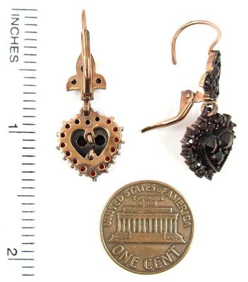 On top of each earring 5 garnets in a fleur-de-lys hold a heart pendant with 18 rosecut garnets and 3 larger round garnet center stones.Each earring measures allover 1.0 x 0.5 inch The weight of one earring is 2.9 gramThe size of the earrings can be seen on the last picture where I added an inch ruler and a coin to compare with.