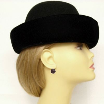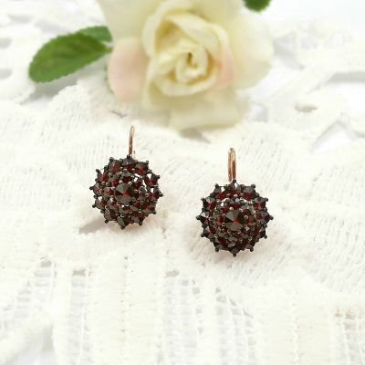Bohemian garnet round earrings. Each earring is set with 21 original Bohemian garnets inch in a fine burgundy darkred color. One earring is 0.8 inch high and 0.55 inch wide. They were made in Sterling Silver (925) with a rosegoldplating like it was usual in the old days. The weight of one earring is 2.4 gram. The dimensions of the earrings can be seen on the last picture where I added an inch ruler and a coin to compare with. Shipment worldwide registered/insured is free. We ship worldwide - not listed countries on demand. Your jewel comes decorated in a beautiful jewel box. Please keep in mind that earrings are TWO pieces with double quantity of stones compared to a ring or pendant. All garnets are original Bohemian.