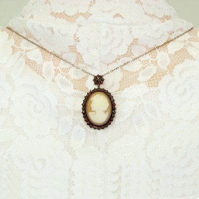 This necklace is set with 36 original Bohemian garnets surrounding a center oval shell cameo measuring 0.84 x 0.64 inch in a fine burgundy darkred color. The necklace\'s center is 1.4 inch high and 0.9 inch wide.The garnets are set in Sterling Silver 925 with a rosegoldplating like it was usual in the old days. The length of the necklace is 17.0 inch and could be adjusted to every length you tell us (for free)The chain is closed in the neck with a springring.The weight of this necklace is 8.6 gram. The size of the necklace can be seen on the last picture where I added an inch ruler and a coin to compare with. Your jewel comes decorated in a beautiful jewel box._All garnets are original Bohemian.