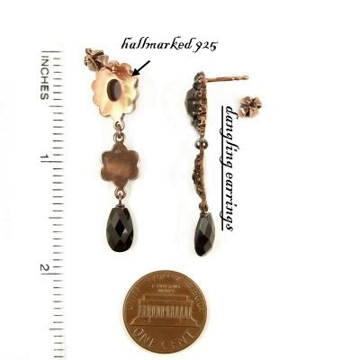 Each earring is set with 18 genuine natural rosecut garnets surrounding a center oval natural garnet measuring 0.33 x 0.27 inch in a fine burgundy darkred color. One earring measures allover 1.7 inch height and 0.46 width.They were made in Sterling Silver (925) with a rosegoldplating.The weight of one earring is 3.6 gram*If you want studs/posts instead of french wires*If you want french wires instead of a studs/posts*let me know - we can exchange it with no charge. The size of the earrings can be seen on the last picture where I added an inch ruler and a coin to compare with. Your jewel comes decorated in a beautiful jewel box.This is huge old stock from a retired garnet wholesaler where I found many old garnet pieces in a forgotten attic. These old garnet jewels were made after WW2.It is made in Sterling Silver (925) with a rosegoldplating like it was usual in these days. All stones are genuine natural garnets.Please keep in mind that earrings are TWO pieces with double quantity of stones compared to a ring or pendant .The **larger stones sometimes may have small natural inclusionsthat can be seen with a loupe if you hold it against the lightbut not with the naked eye or when you wear it. See pictures.