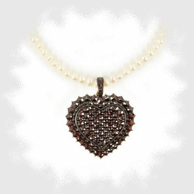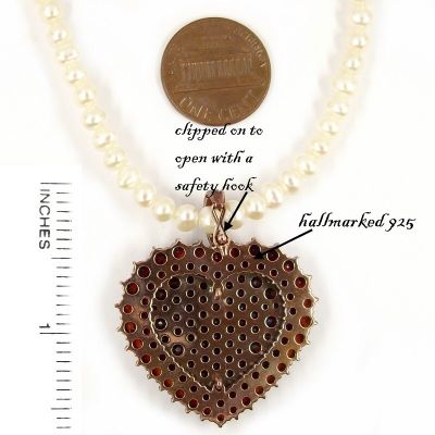 Bohemian garnet necklace heart pendantclipped on a freshwater pearlchainThis necklace is set with 118 original Bohemian garnets in afine burgundy darkred color with a diameter of 1.5 ” by 1.3 inch. The Bohemian garnets are set in Sterling Silver 925 with a rosegoldplating like it was usual in the old days. The garnet heart is clipped on a freshwater pearlchainthat is closed with a lobster claw. If you want to useyour own pearlchain please ask for your specialprice without the pearlchain. The length of the pearl chain is 17 inch .The chain is closed in the neck with a lobster clawThe weight of the full necklace is 23 grams. The size of the necklace can be seen on the last picture where I added an inch ruler and a coin to compare with. Your jewel comes decorated in a beautiful black leatherette jewel box.